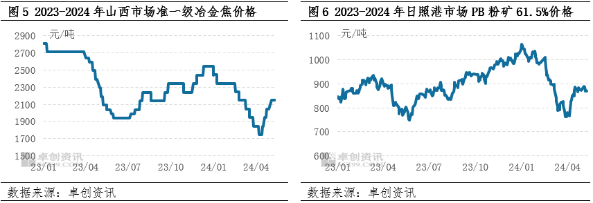 预计5月中下旬原料价格窄幅震荡。5月以来,焦炭及铁矿石价格呈现稳中窄幅调整走势。其中焦炭价格第5轮提涨目前仍未有钢厂回应,截至2024年5月11日,山西市场准一级冶金焦成交价为2135.00元/吨,较4月底价格持平,原因是钢厂利润水平收缩,对提涨抵触情绪较高,暂未回应提涨,市场观望情绪增加;铁矿石价格震荡运行,截至2024年5月11日,日照港市场PB粉矿(61.5%)均价为868.00元/吨,较4月底价格小跌5.00元/吨,跌幅为0.57%,原因是5月上旬钢厂高炉开工率继续回升,卓创资讯调研的169家钢厂577座高炉的开工率为84.75%,较4月底增加0.52个百分点,对原料仍或维持一定的刚需补库韧性,但成材库存数据表现分化,加上钢厂利润空间收窄,市场挺价情绪减弱,期现价格回调,港口现货成交活跃度较低,多空交织,铁矿石价格窄幅震荡运行。考虑5月中下旬终端需求量或延续较为平稳状态,对原料需求量或变化不大,预计5月中下旬原料价格稳中窄幅调整。