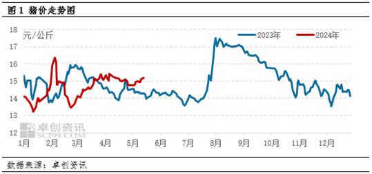 五一假期后,养殖端出栏受限,需求支撑尚可,带动5月上旬猪价震荡上涨。卓创资讯监测,截至5月13日,全国生猪均价为15.18元/公斤,月内平均15.02元/公斤。养殖端出栏有限、看涨情绪较浓是5月上旬猪价上涨的主要原因。