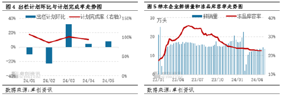 从需求看,经过前期持续亏损,屠宰企业冻品入库意愿较低,卓创资讯监测2024年样本企业冻品库容率缓慢下滑,截至5月9日,样本企业冻品库容率为22.57%。同时,2024年终端需求同比表现疲软,猪肉需求疲软导致猪肉价格难涨,叠加屠宰企业冻品入库意愿不足,二者共同导致屠宰企业高价收猪意愿较低,利空下旬猪价。