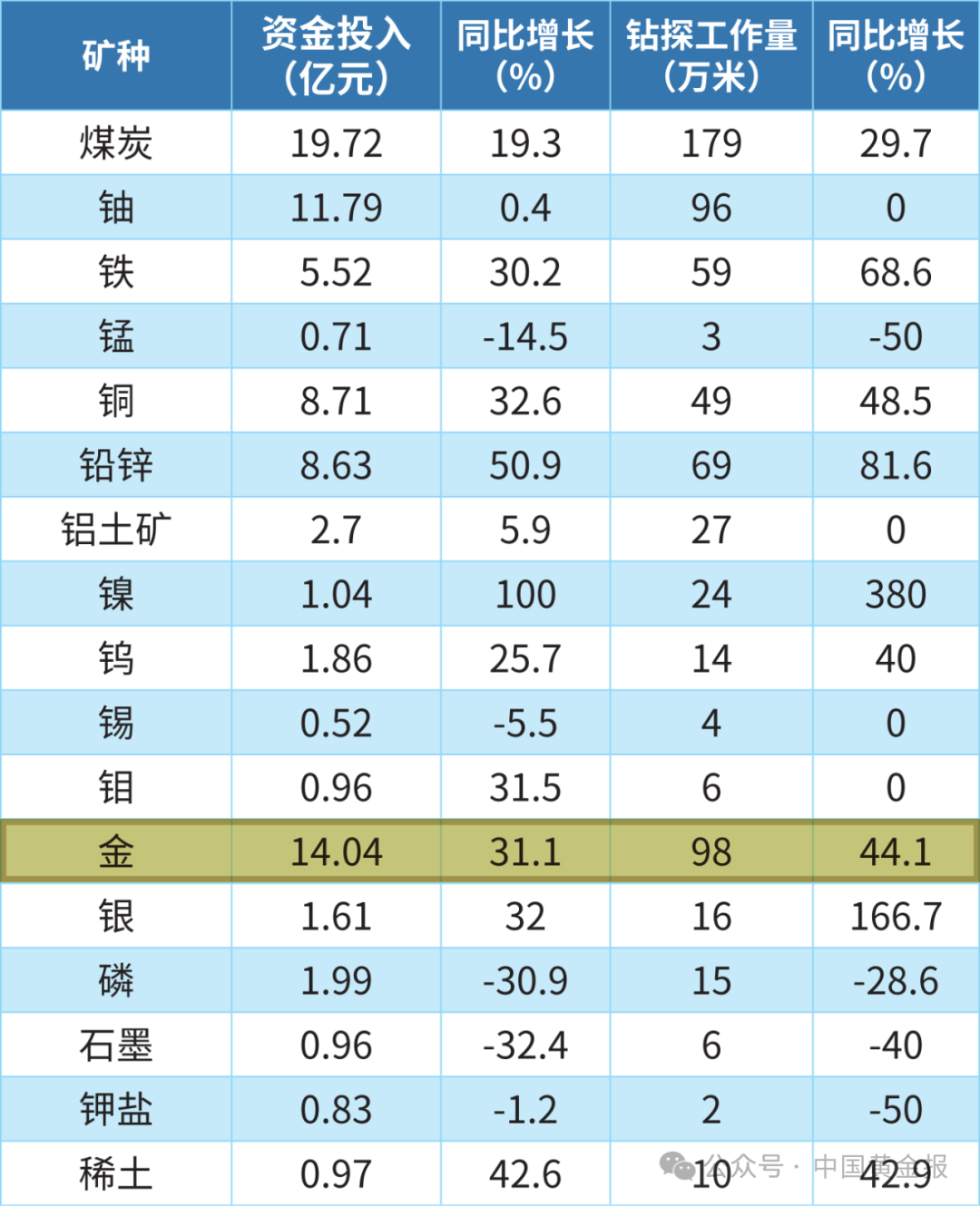 据年报统计,2023年,金钻探工作量达到98万米,同比增长44.1%;金是探矿权数量最多的5个矿种之一,为2334个;新发现金矿产地4处(大型1处、中型1处、小型2处),完成阶段性勘查的金矿产地19处(普查8处、详查6处、勘探5处)。