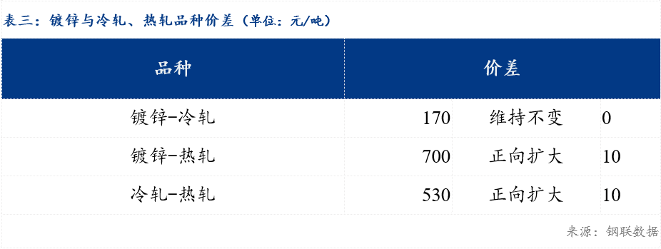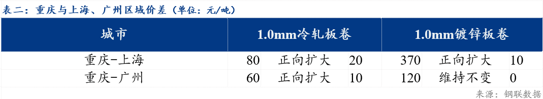 重庆、上海地区冷轧板卷区域价差扩大20元/吨;重庆、广州冷轧板卷区域价差扩大10元/吨。重庆、上海镀锌板卷区域价差扩大10元/吨;重庆、广州镀锌板卷区域价差维持不变。镀锌、冷轧品种价差维持不变;镀锌、热轧品种价差维持扩大10元/吨;冷轧、热轧品种价差扩大10元/吨。