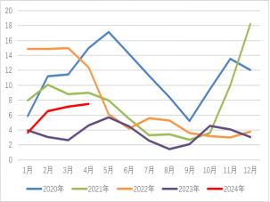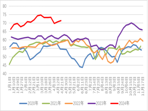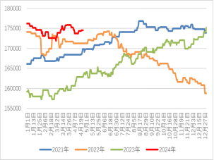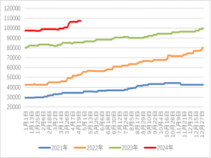 玻璃生产利润有所回升,支撑供应维持高位运行。截止至2024年4月22日,钢联数据统计国内浮法玻璃产能为17.46万吨/日,环比增加0.11%,同比增加9.4%。光伏玻璃产能为10.73万吨/日,环比增加1.04%,同比增加25.82%。