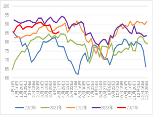 春节至今,纯碱库存呈现大幅累积后走平态势,近期库存窄幅调整,可能是由于部分碱厂的外库在数据上暂时掩盖了库存的压力。截止至2024年4月26日,国内纯碱厂家总库存为86.04万吨,环比减少2.06%,同比增加97%。