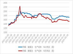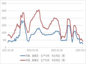 随着纯碱价格的上涨,生产利润随之回升,在当前纯碱利润依然非常可观的前提下,碱厂主动减产的可能性较小。截止至2024年4月26日,同花顺资讯统计国内氨碱企业生产利润466.78元/吨,环比增加82.3%,同比减少46.78%;联产企业生产利润533.6元/吨,环比增加29.8%,同比减少61.28%。