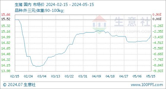 5月15日,生意社生猪基准价为14.97元/公斤,与本月初(14.85元/公斤)相比,上涨了0.81%。