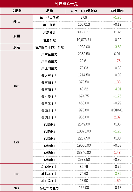 隔夜,LME铜收跌131美元,跌幅1.28%,LME铝收涨1美元,涨幅0.06%,LME锌收跌9美元,跌幅0.3%,LME镍收跌130美元,跌幅0.68%,LME锡收涨485美元,涨幅1.48%,LME铅收涨18美元,涨幅0.8%。消息面:美国4月PPI环比上升0.5%,超出预期的0.3%。美国上周初请失业金人数为23.1万人,创去年8月26日当周以来新高。中汽协公布数据显示, 4月汽车产销分别完成240.6万辆和235.9万辆,环比分别下降10.5%和12.5%,同比分别增长12.8%和9.3%。据SMM调研数据显示,4月全国精铜杆产量合计81.11万吨,较3月份环比下降3.85万吨,开工率为63.28%,环比下滑3个百分点,同比下滑3.96个百分点。最新全国主流地区铜库存减0.21万吨至40.01万吨,国内电解铝社会库存增0.02万吨至77.82万吨,铝棒库存减1.09万吨至20.02万吨,七地锌锭库存增0.17万吨至21.46万吨。金属库存高位回落,现货升水短期低位。美元震荡延续,国内铜冶炼厂出口增加,操作建议,金属短多偏多思路为主,铜远月跨期正套可持有。观点仅供参考。
