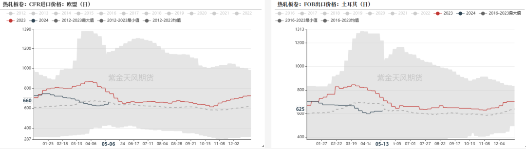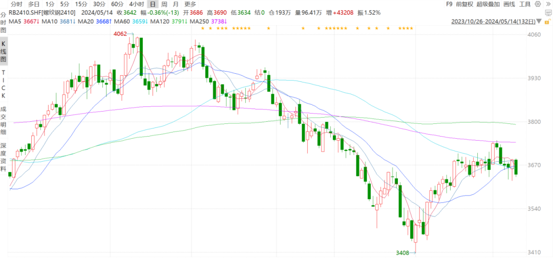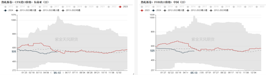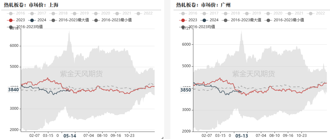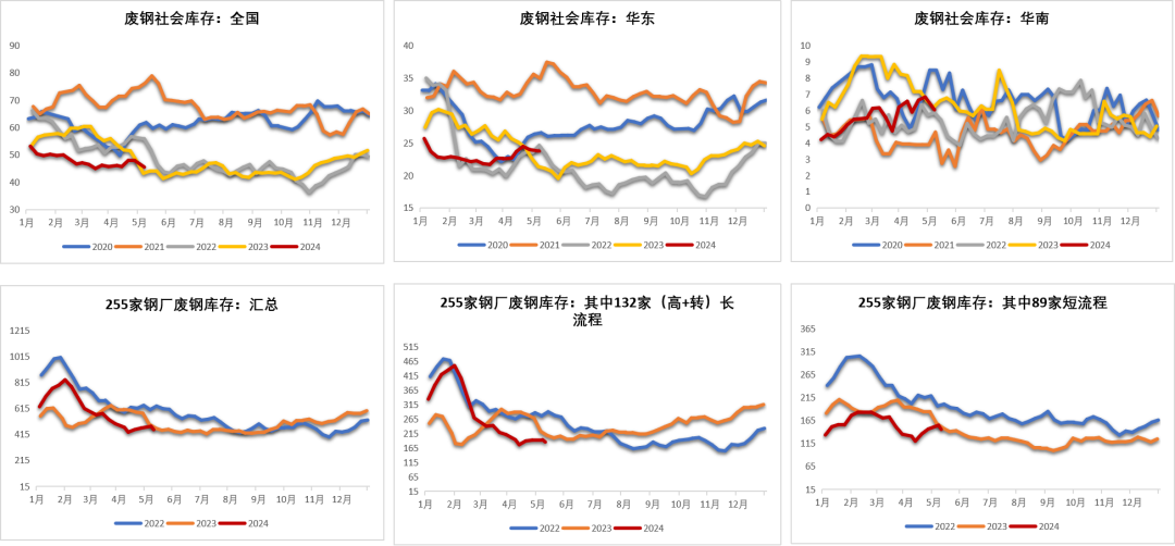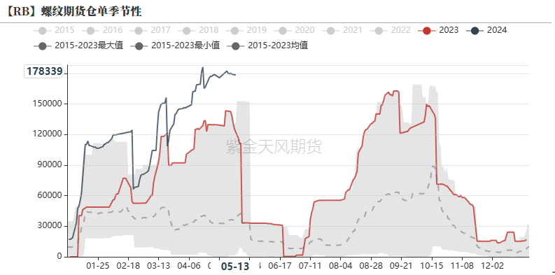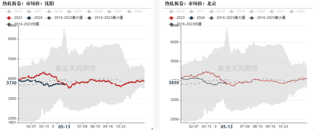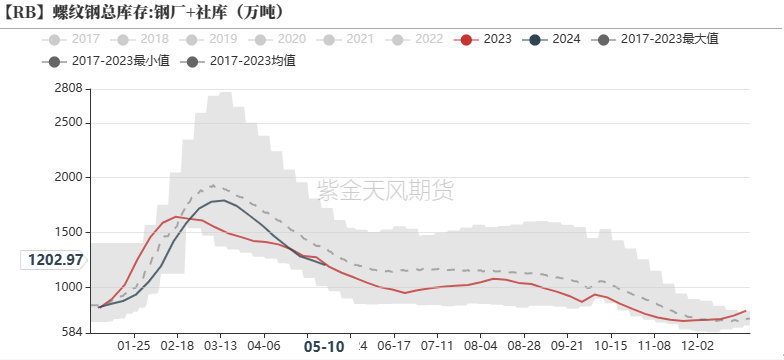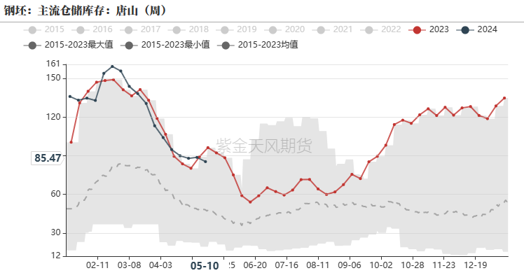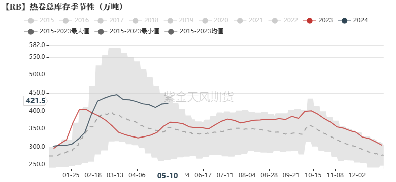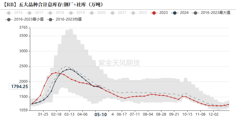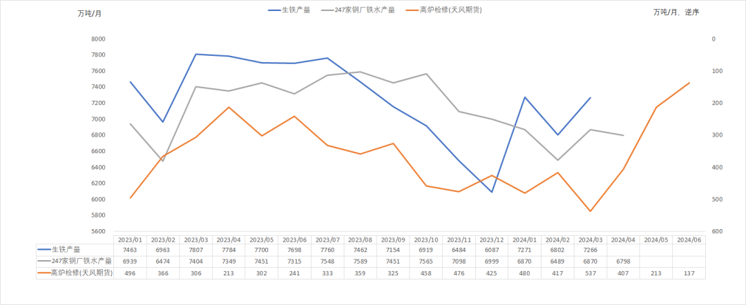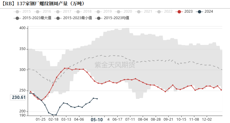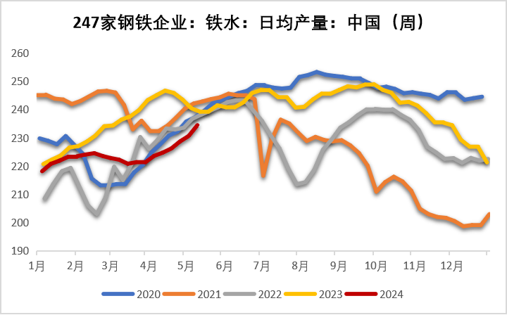 截至2024年5月10日,日均生铁产量为234.5万吨,环比增加3.83万吨(增幅1.66%);相比于去年同期下降2.0%。