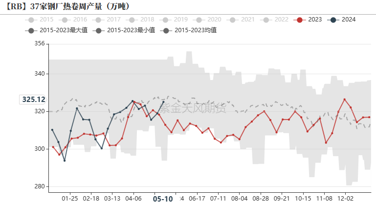其中,螺纹产量共230.61万吨,环比上周下降1.18万吨(降幅0.5%),相较于去年同期下降14.0%。热卷产量为325.12万吨,环比上周上升6.12万吨(增幅1.9%),相较于去年同期上升3.9%。