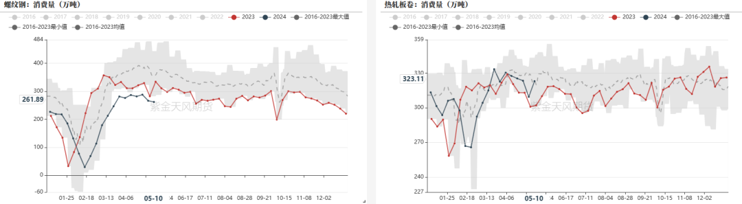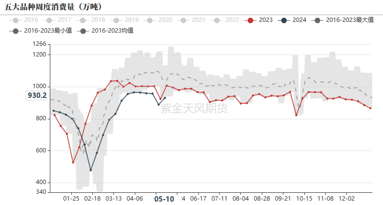 需求方面,本周五大品种消费总量达930.2万吨,环比上升41.37万吨,增幅4.7%,相比于去年同期上升4.7%。