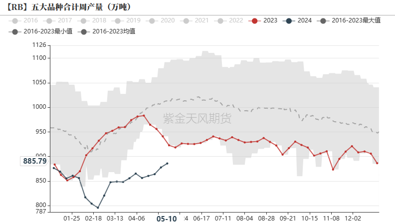 本周,五大品种合计产量为885.79万吨,环比上周上升8.07万吨(增幅0.9%),去年同期产量为922.66万吨,同比下降4.0%。