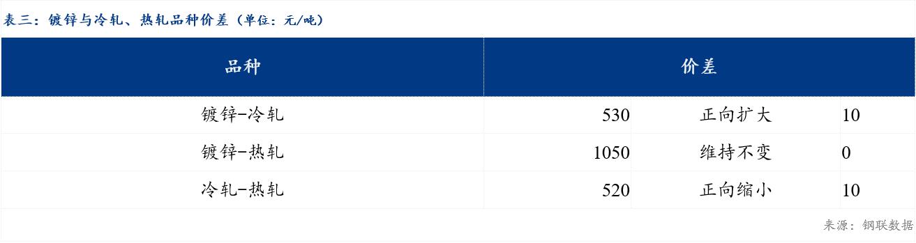 今日冷轧板卷乐从与天津价差较上一交易日收窄10元/吨,乐从与上海价差较上一交易日收窄20元/吨;镀锌板卷乐从与天津价差较上一交易日持平,与上海价差较上一交易日收窄10元/吨。品种价差方面,镀冷价差较上一交易日扩大10元/吨,镀热价差较上一交易日持平,冷热价差较上一交易日收窄10元/吨。