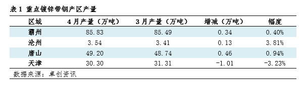 4月镀锌带钢产量小幅增加环比增幅0.23%
