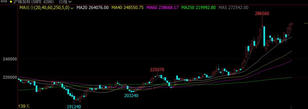 近日,锡价持续攀升。5月15日,沪锡期货持续冲高,主力合约收涨2.67%,延续强势运行。