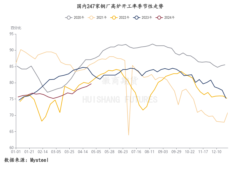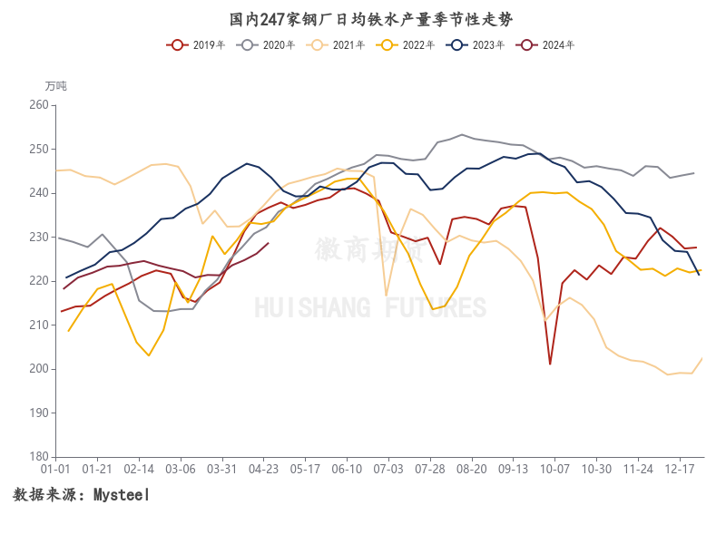 一季度以来,国内钢厂生产意愿明显低于市场预期,日均铁水产量及高炉开工率等数据显著低于往年同期,这也是一季度黑色系整体处于负反馈行情的根本原因。进入4月后,日均铁水产量开始环比回升,从220万吨附近水平回升至228万吨附近,虽仍低于往年同期,但恢复趋势明显。