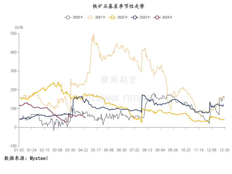 现货方面,根据钢联数据,截至4月29日,日照港61.5%PB粉价格为870元/湿吨,日照港56.5%超特粉价格为717元/湿吨,日照港65%卡拉斯加粉价格为1006元/湿吨。今年以来,铁矿基差依然持续处于现货升水态势中,不过升水区间有所压缩,主要是由于一季度以来黑色系整体表现偏弱,炉料回调阶段基差自然呈现收缩状态。后续来看,铁矿基差大概率依然围绕100左右升水来回波动。
