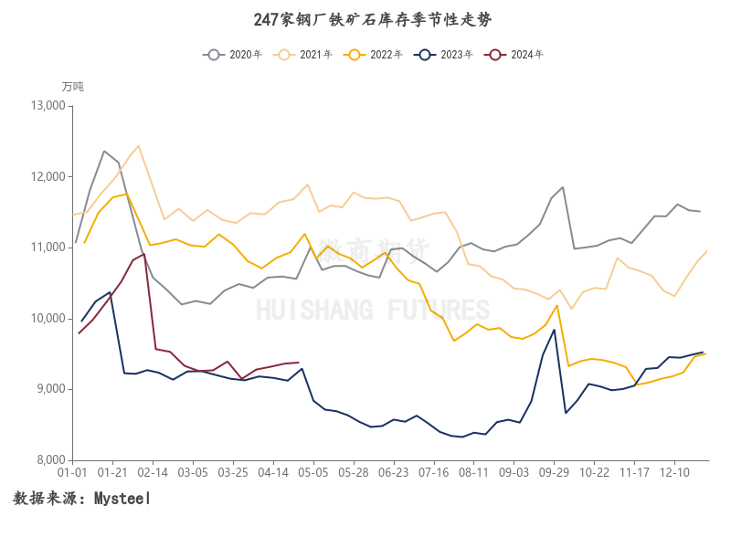钢厂铁矿石库存方面,春节期间钢厂原料库存持续累库,最高曾达到约1.1亿吨的位置,节后则快速下行,不过由于一季度钢厂产量偏低,因此钢厂铁矿库存稳定在9000多万吨的水平。截至4月30日当周,Mysteel统计国内247家钢厂铁矿石库存为9379.93万吨。