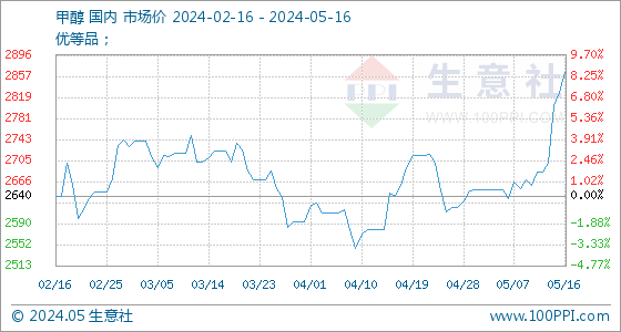 5月16日,生意社甲醇基准价为2828.33元/吨,与本月初(2651.67元/吨)相比,上涨了6.66%。