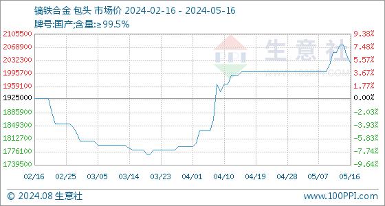 5月16日,生意社镝铁合金基准价为2045000.00元/吨,与本月初(2000000.00元/吨)相比,上涨了2.25%。
