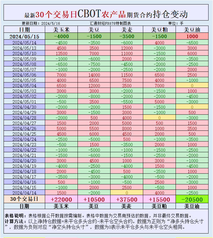 根据汇通财经观察,海外交易商估算的结果显示,本周三(5月15日),大宗商品基金增加CBOT美豆、美玉米、美豆粕、美麦投机性净空头头寸,增加美豆油投机性净多头头寸。最新30个交易日,大宗商品基金增加美豆粕、美麦、美玉米、美豆投机性净多头头寸,增加美豆油投机性净空头头寸。