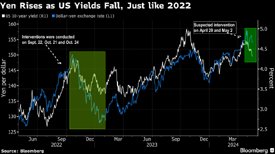日元走强并逐步远离近几周疑似引发干预的区域,走势开始看起来与2022年时相似,当时美国经济数据疲软使得日本官方免于出手行动。