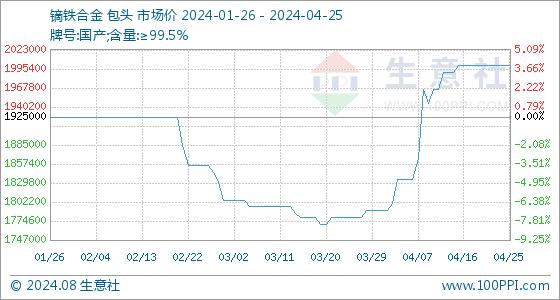4月25日,生意社镝铁合金基准价为2000000.00元/吨,与本月初(1790000.00元/吨)相比,上涨了11.73%。