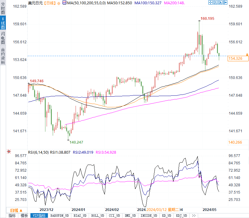 美元/日元最新一轮跌势已经逆转了从触及151.86低点后出现的大部分涨幅。美元/日元在4月29日触及160.24高点,日本当局此后至少疑似对汇市进行两轮干预,该货币对随后在5月3日跌至151.86。
