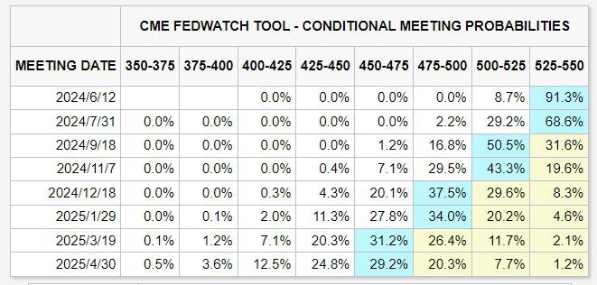 根据CME的FedWatch工具,市场预计降息最早可能出现在今年的9月,概率为50.5%,第二次降息时点为12月,概率为37.5%。