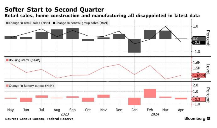 在周四公布房屋开工和工业生产数据后,亚特兰大联储的GDPNow模型下调了对第二季度经济增长的预期。与此同时,道琼斯工业平均指数首次突破4万点大关,一天前标普500指数则创下2024年以来第23个历史新高纪录。