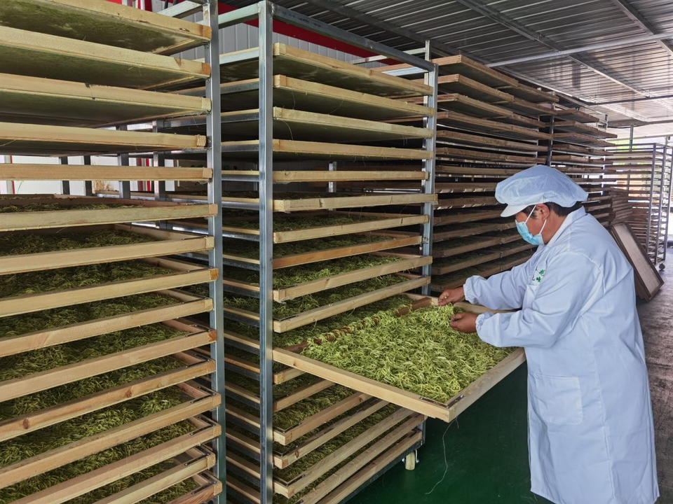 金银花红茶制作车间里,工人们正有序地将金银花烘干、揉搓、翻炒、装箱……随后将通过“线上直播+线下订单”的方式进行销售,现如今,息陬镇金银花种植、收购、加工、销售一体化的产业链已基本形成。