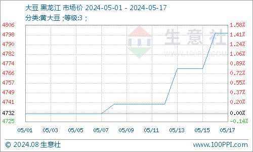 据生意社商品行情分析系统显示:5月开始,国产大豆行情整体陆续回暖,行情振荡上涨。5月1日,国产大豆市场均价4732元/吨,5月17日,国产大豆市场均价4800元/吨,价格上涨1.44%。