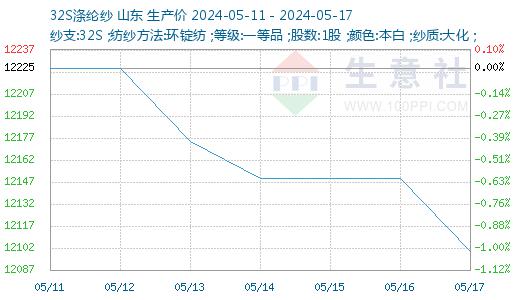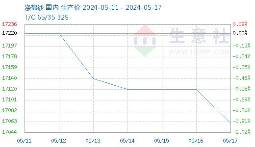 据生意社商品行情分析系统显示:本周(5.11-5.17)纯涤纱及涤棉纱市场行情行情越淡,厂家报价小幅下调。截止2024年5月17山东地区32S纯涤纱市场参考价格在12100元/吨,较上周价格12225元/吨,下跌125元/吨,跌幅1.02%;T/C65/3532S涤棉纱市场参考价格在17060元/吨,较上周价格17220元/吨,下跌160元/吨,跌幅0.93%。