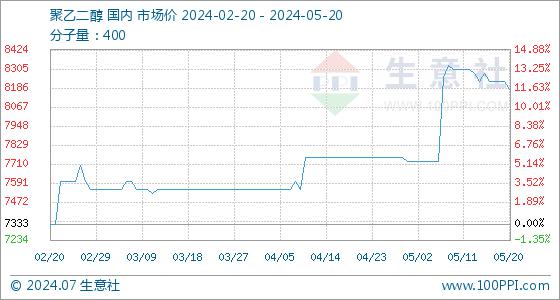 5月20日,生意社聚乙二醇基准价为8225.00元/吨,与本月初(7725.00元/吨)相比,上涨了6.47%。