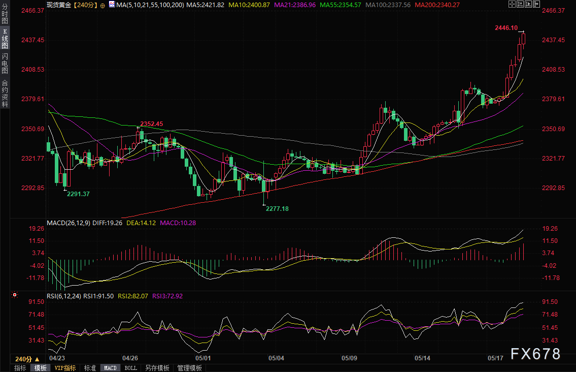 汇通财经APP讯——周一(5月20日)亚市尾盘,现货黄金维持日内强劲涨势,一度刷新历史高点至2446.10美元/盎司,日内大涨近30美元。FXStreet分析师Lallalit Srijandorn最新撰文,对金价技术走势进行分析。