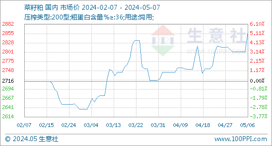 5月7日,生意社菜籽粕基准价为2860.00元/吨,与本月初(2803.33元/吨)相比,上涨了2.02%。