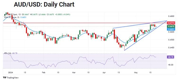 澳元周二交投于0.6660附近。澳美日线图显示上升三角形形态。此外,14天RSI显示看涨情绪,保持在50关口上方。