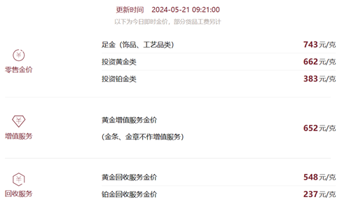 与此同时,国内黄金饰品市场也呈现出价格上涨的态势。据上海黄金饰品行业协会最新行业动态,老凤祥、老庙、中国黄金及周大福等品牌的足金报价均有所上升。其中,周大福5月21日官网显示的足金饰品零售金价已突破740元/克,为743元/克,投资黄金类662元/克。黄金回收价548元/克。