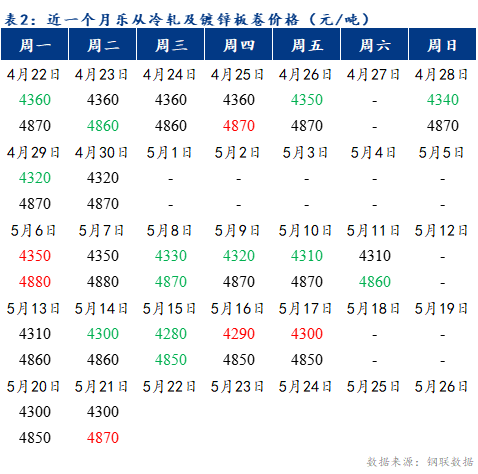 截止2024年5月21日17:30,冷轧板卷月均价为4325元/吨,镀锌板卷月均价为4865元/吨。