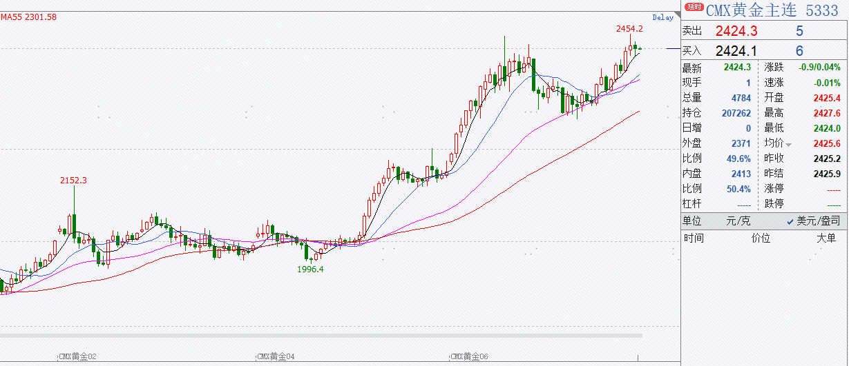 截止5月21日收盘,COMEX黄金6月合约收盘于2425.2美元/盎司,跌幅0.55%,成交225980手,持仓207262手;COMEX白银7月合约收盘于32.205美元/盎司,跌幅0.68%,成交107064手,持仓151374手。