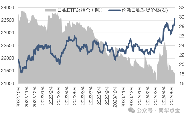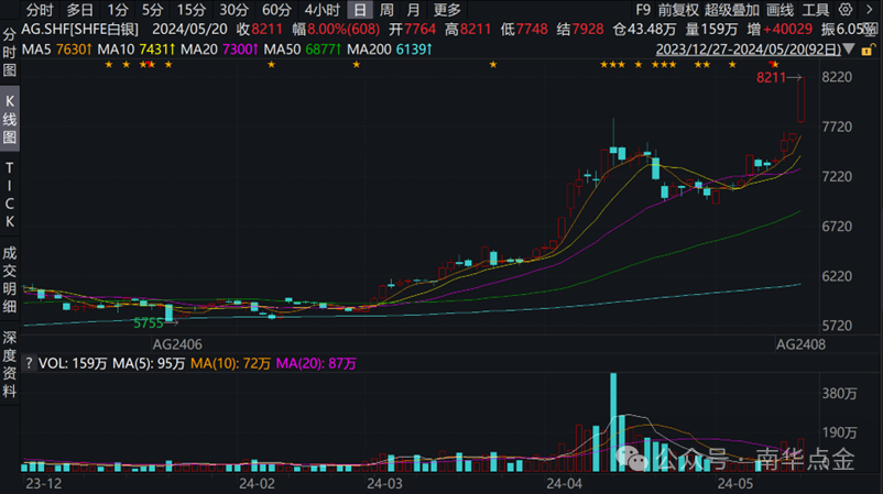 周一上期所白银期货所有合约一致封8%涨停板,盘中虽有短暂打开,但很快重新封上涨停板,其中沪银2408合约收于8211元/千克,创2013年开新高,强势不言而喻。黄金周一走势亦强劲,伦敦金盘中突破2430前高,沪金2408合约周一最终收于578.84元/克。贵金属的强势并非偶然,在4月下旬贵金属启动回调后,于劳动节节后重新回升,呈现V型反转走势,其中白银走势强于黄金。伦敦白银在5月17号夜盘开盘强势向上突破30关口后加速上行,同时带动国内白银价格刷新高,金银比有所回落。
