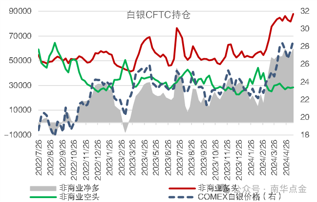 资金面看,周五夜盘沪银期货与COMEX白银期货在突破阶段,呈现成交与持仓双双放量。滞后的截止于上周二的CFTC持仓报告则显示,COMEX白银市场多头投机资金在此前一周已有提前布局。