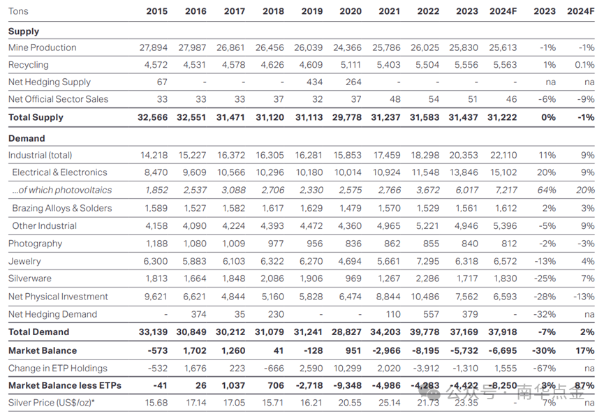 图表2.3:世界白银协会年度白银平衡表(单位:吨)