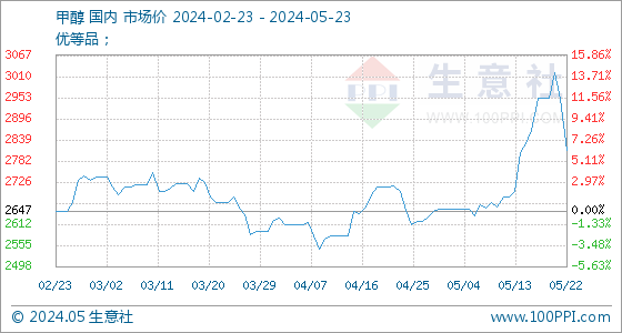 5月23日,生意社甲醇基准价为2811.67元/吨,与本月初(2651.67元/吨)相比,上涨了6.03%。