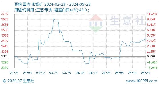 5月23日,生意社豆粕基准价为3498.00元/吨,与本月初(3340.00元/吨)相比,上涨了4.73%。