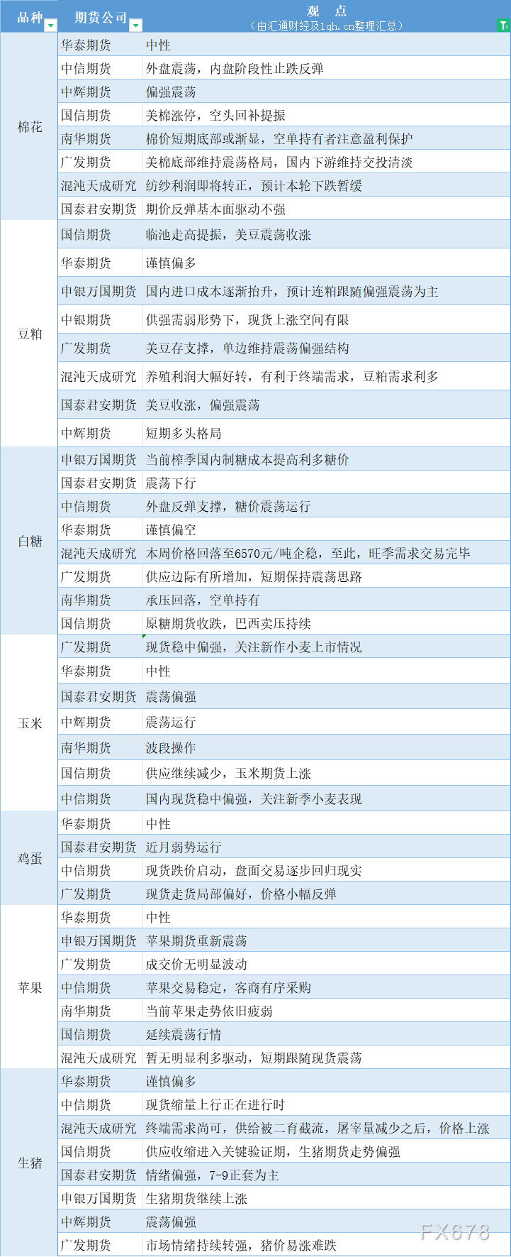 汇通财经APP讯——期货公司观点汇总一张图:4月23日农产品(棉花、豆粕、白糖、玉米、鸡蛋、生猪等)