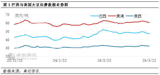 根据卓创资讯统计的数据显示,2024年至今(5月22日),美湾平均运费为59.72美元/吨,巴西平均运费为45.91美元/吨,美西31.64美元/吨。从价格看,美湾价格最高,巴西次之,美西最低。由于美国大豆产区在美国中东部,因此两个出口方向一个是南下,一个是西向。而运费的价格,一方面与运距有关,另一方面也与运输路线有一定关系。比如美湾运输至中国部分船只经过巴拿马运河,今年该运河由于气候问题导致运力紧张,从而导致成本提升。