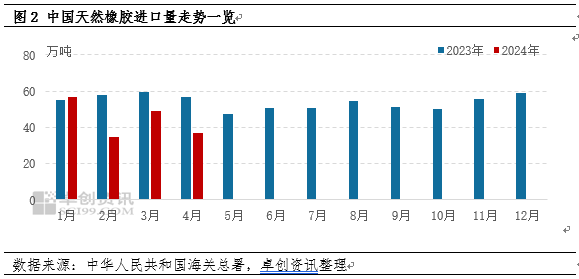 从国内进口情况来看,5月份是季节性进口低点,主要是国外产区向开割期过渡,老胶库存已经逐步得到消化,新胶尚未全面上量,预计2024年5月份进口量同样处于较低位置。此前3月中旬及4月份上旬期货反弹刺激套利盘加仓情绪,以采购6月份以及更远月份为主,预计6月份随着产区上量,以及前期套利采购的船货陆续到港,国内进口量将呈现增加趋势,但增量有限。