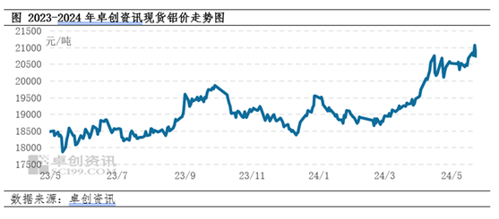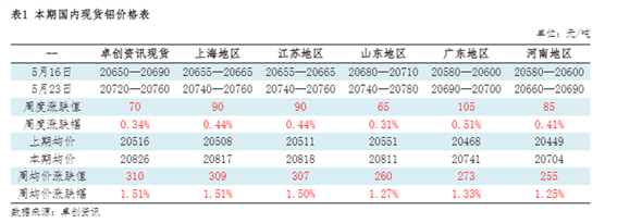 本期国内现货市场消息面交错影响,铝价继续冲高后回调。截至5月23日,卓创资讯现货铝价20720-20760元/吨,日均价20740元/吨,较上期上涨70元/吨,涨幅0.34%;较去年同期上涨2380元/吨,涨幅12.96%。期内均价20826元/吨,较上周上涨310元/吨,涨幅1.51%。