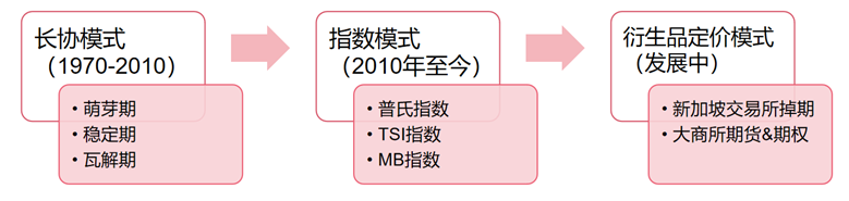 全球范围内,铁矿石因供给和需求在地理上分布不均,从而催生了巨大的海运贸易市场,其定价模式也在不断演变,从最初的长协定价模式,转变为目前应用最广的指数定价模式,以及逐步发展完善的衍生品定价模式。