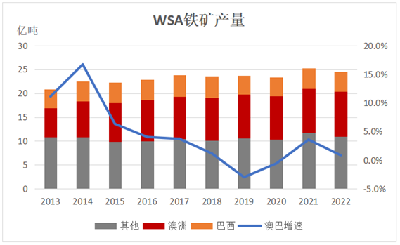 铁矿石是我国工业化进程中至关重要的资源,但我国的铁矿石资源以品位低、规模小、需选矿、高成本地下开采为主,平均铁矿石品位只有34.5%,与世界平均46.7%的高品位铁矿资源形成鲜明对比,因此我国对进口铁矿石的依赖程度较高。其中澳洲和巴西两国因其铁矿石资源品位高、规模大、无需选矿、低成本露天开采为主,进而成为全球最主要的铁矿石出口国家,自2013年起,澳巴两国铁矿供应量占全球总量50%以上。
