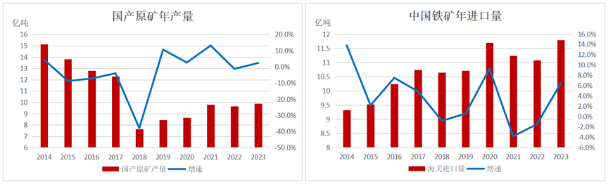 我国国产铁矿在近十年中也经历了2个阶段的变化,2014年至2018年,海外低成本铁矿供应快速增加,抢占了我国国产矿的市场份额,使得国产矿产量逐年下降。且2018年国内环保限产政策趋严,国产矿采矿过程会造成各种的污染,因此大量产能被叫停,当年产量同比骤减38%。2019年至今国产矿产量转为慢增长,2022年1月中国钢铁工业协会提出“基石计划”,计划的主要内容包括国内新增铁矿开发、境外新增权益铁矿等,用10至15年时间改变我国铁资源来源的构成,因此我国国产矿产量将长期保持慢增长的格局至2035年。